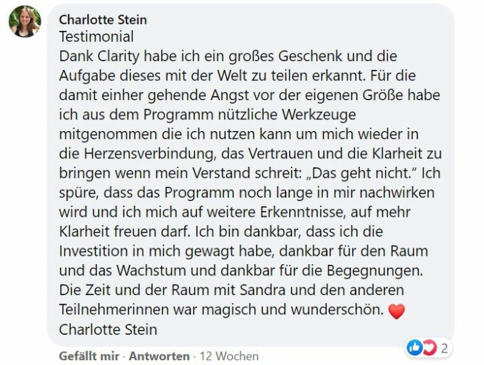Ich kann Sandra allen Menschen empfehlen, die auf der Suche sind, denen etwas im Leben fehlt und die bereit sind, sich zu öffnen und neue Wege einzuschlagen. Danke, Sandra – ohne dich hätte ich nicht erreicht, was ich erreicht habe. Ohne dich würde ich mich immer noch gedanklich im Kreis drehen. Ohne dich wäre ich immer noch unzufrieden. Durch dich habe ich so viel über mich gelernt. Ich merke mittlerweile, wenn sich mein Ego meldet, um mich klein halten zu wollen. Ich habe den Unterschied verstanden und kann ihn fühlen, wenn ich etwas aus Angst tue und wenn ich etwas aus Liebe tue. Durch dich habe ich meine Mission gefunden. Durch dich kann mein Herz wieder lachen. Durch dich fühle ich mich wieder glücklich.