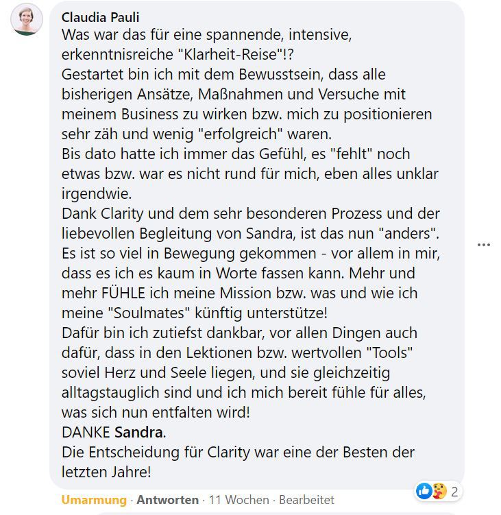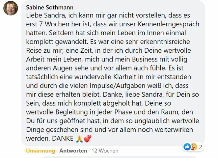 Sandra hat mich von Anfang an bei meinem Businessaufbau begleitet. Ich bin dabei im Laufe der Zeit mit ihr zusammen enorm gewachsen. Was sie jedes Mal wieder aus mir herausholt, ist unglaublich. Einen besonderen Schub hat mir die Besinnung auf meine Seele gegeben. Anfangs konnte ich damit noch nicht viel anfangen. Doch Sandra hat mir durch ihre einzigartige Art und Weise gezeigt, wie ich mit meiner Seele in Verbindung komme und bleibe. Das ist so sehr wertvoll, für das gesamte Leben und besonders auch fürs Business. Ich kann jedem nur empfehlen, diesen Weg zu gehen. Danke dir!